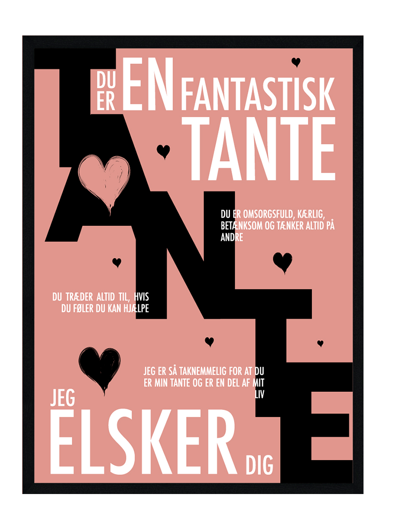 Vores flotte Tante plakat er en helt personlig gave og siger alle de søde ting til din Tante som du i hverdagen har svært ved at sige. Tante plakaten er på alle mulige måder den perfekte gave til din Tante som betyder alt for dig.
