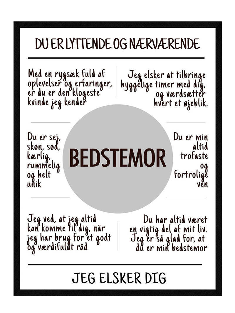En bedstemor har altid været der. Hun er nok en af de første, efter far og mor, der har set barnebarnet, og holdt det i sine arme. Hvis man er taknemmelig for alt dette, og ikke lige får det sagt, så vil denne plakat give lykke og tårer i øjnene på enhver bedstemor.