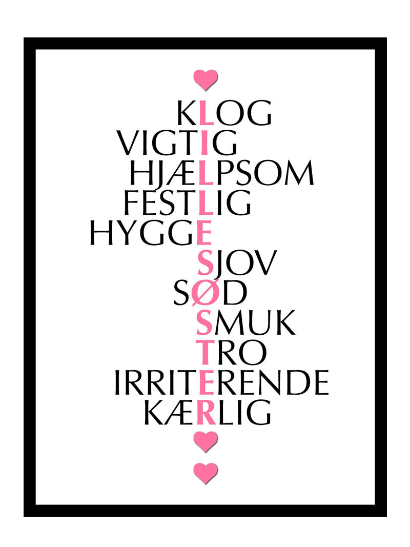 Har du og din lillesøster / søstre et helt særligt bånd og vil du gerne fortælle hende, hvor stor pris du sætter på jeres tætte forhold? Så er denne plakat måske noget for dig.