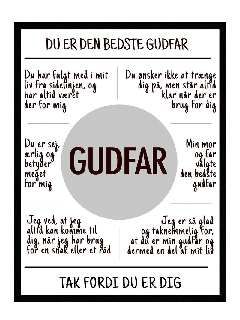 Så hvis du også mener, at din Gudfar er en helt speciel person i dit liv og du gerne vil fortælle ham, at du tænker på ham og mindes alle de gode minder i har haft, så er denne Gudfar plakat lige noget for dig.