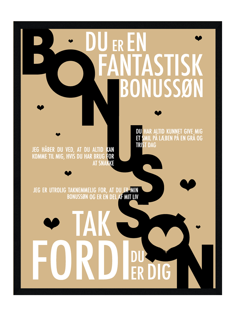 Vores flotte Bonussøn plakat er en helt personlig gave og siger alle de søde ting til din Bonussøn som du i hverdagen har svært ved at sige. Bonussøn plakaten er på alle mulige måder den perfekte gave til din Bonussøn som betyder alt for dig.