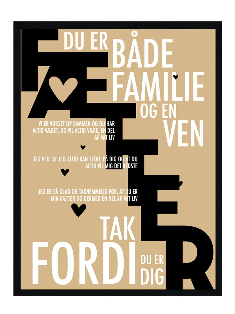 Vores flotte Fætter plakat er en helt personlig gave og siger alle de søde ting til din Fætter som du i hverdagen har svært ved at sige. Fætter plakaten er på alle mulige måder den perfekte gave til din Fætter som betyder alt for dig.