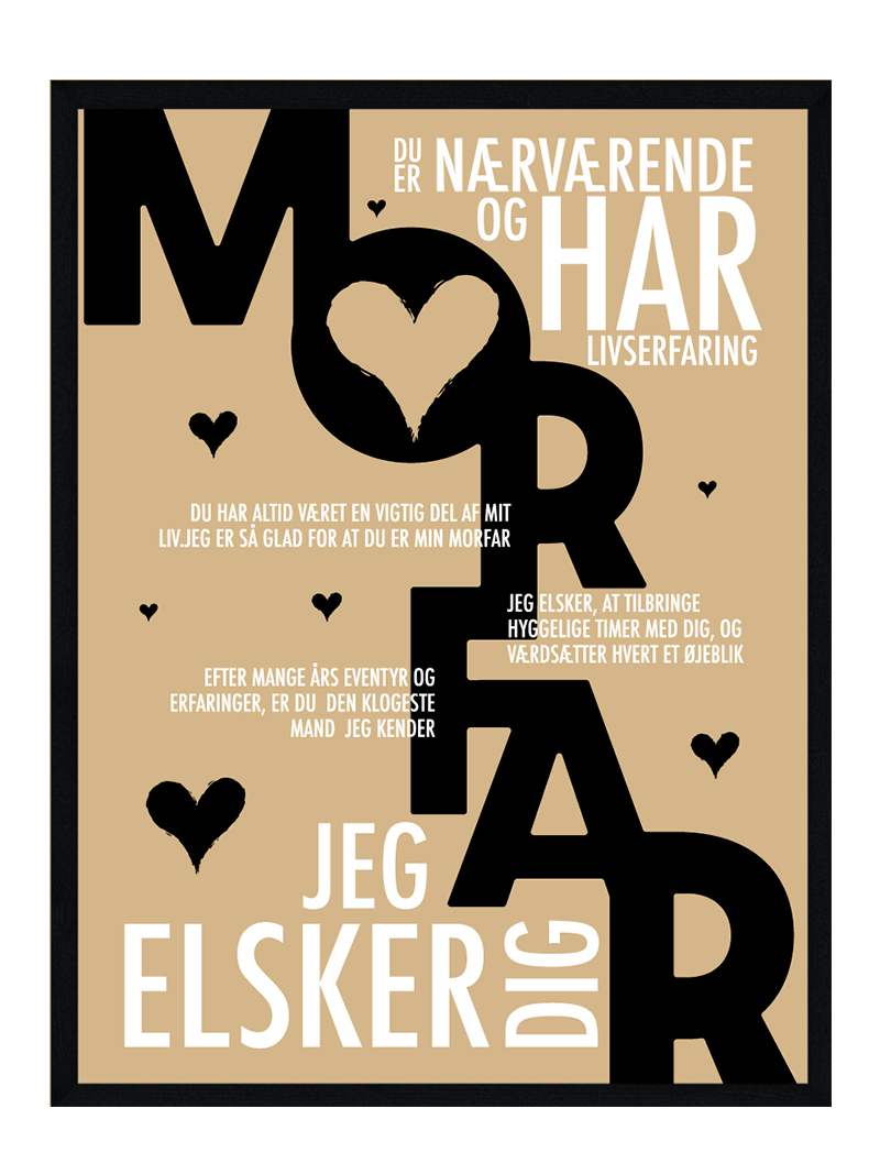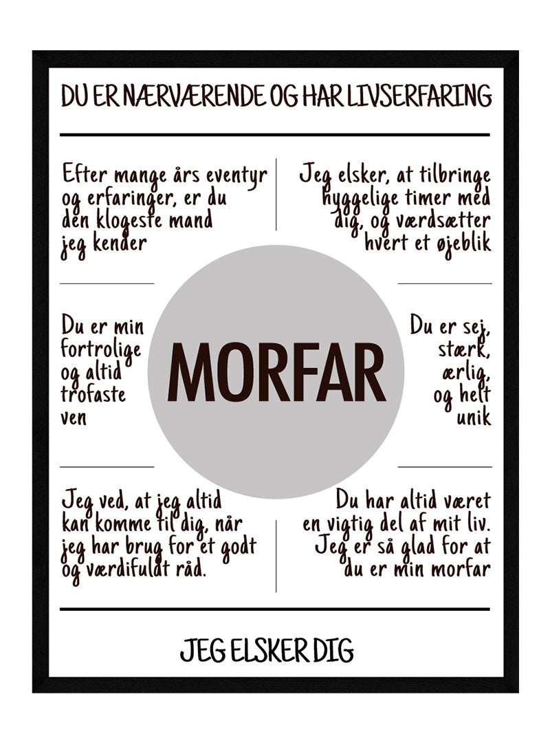 Morfar plakaten slutter med en hyldest til en morfar fra et dedikeret barnebarn. Overskriften og afslutnings citatet på morfar plakaten opsummerer og afrunder på bedste vis plakaten. Denne morfar plakat vil gå enhver morfar lige i hjertet.