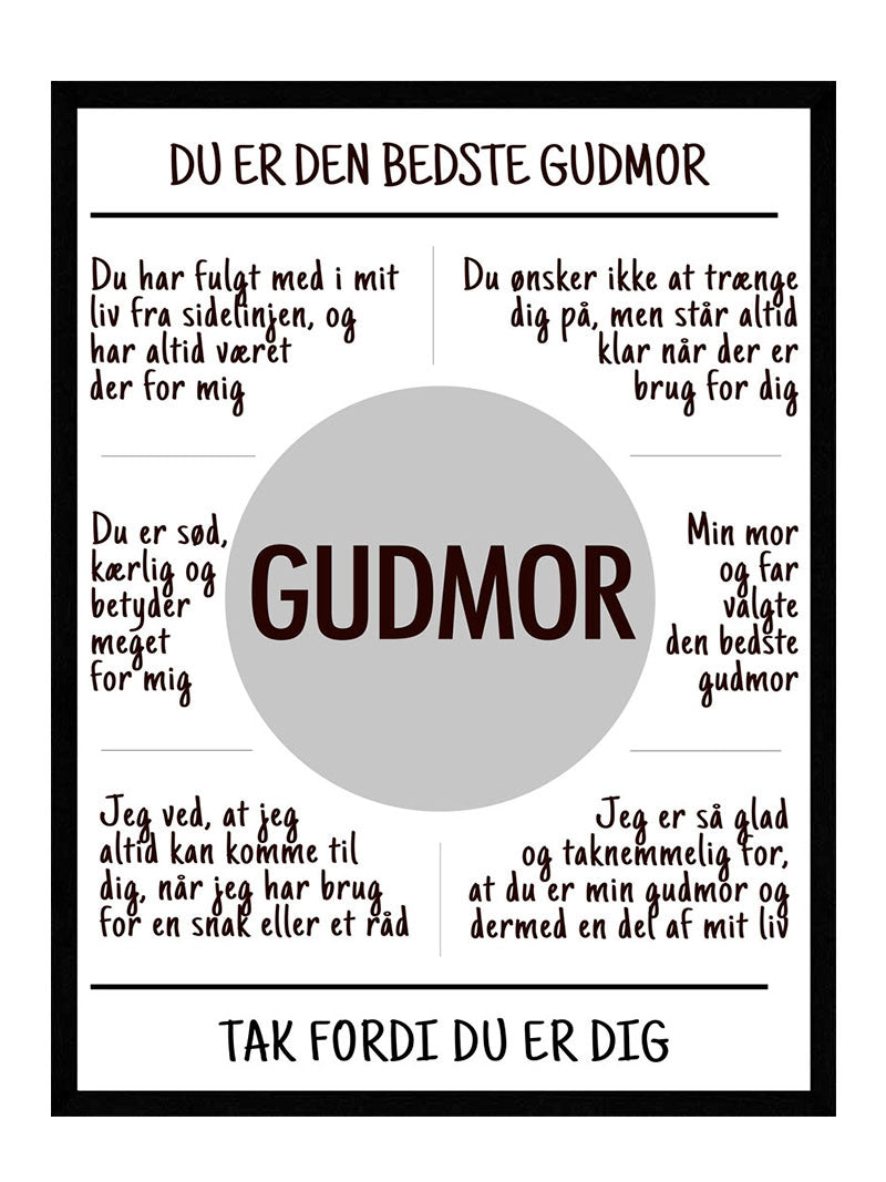 Så hvis du også mener, at din Gudmor er en helt speciel person i dit liv og du gerne vil fortælle hende, at du tænker på hende og mindes alle de gode minder i har haft, så er denne Gudmor plakat lige noget for dig.