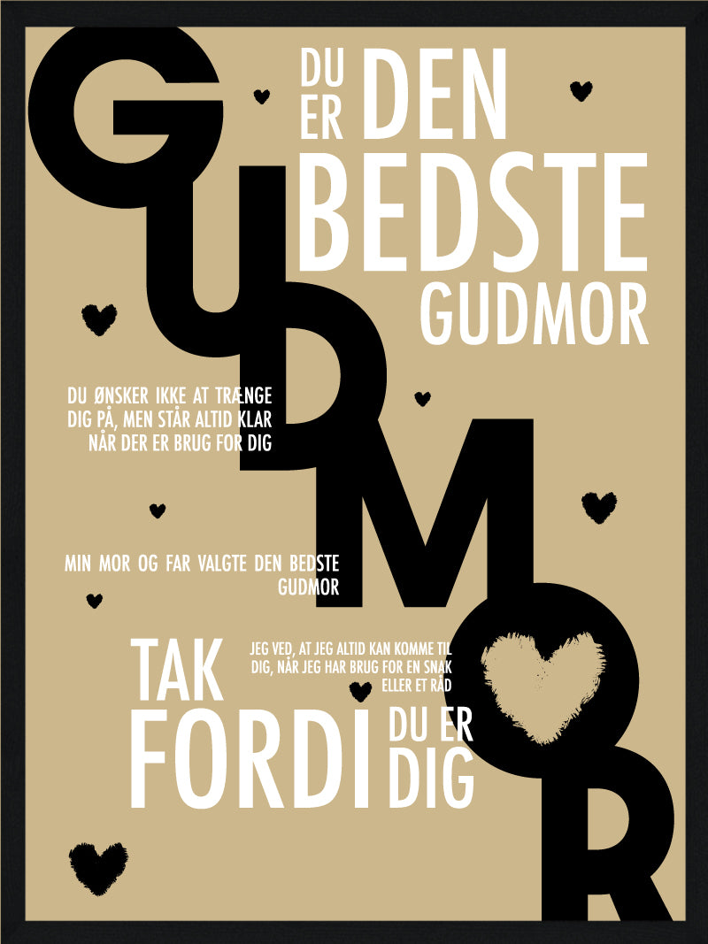 Vores flotte Gudmor plakat er en helt personlig gave og siger alle de søde ting til din Gudmor som du i hverdagen har svært ved at sige. Gudmor plakaten er på alle mulige måder den perfekte gave til din Bedstemor som betyder alt for dig.