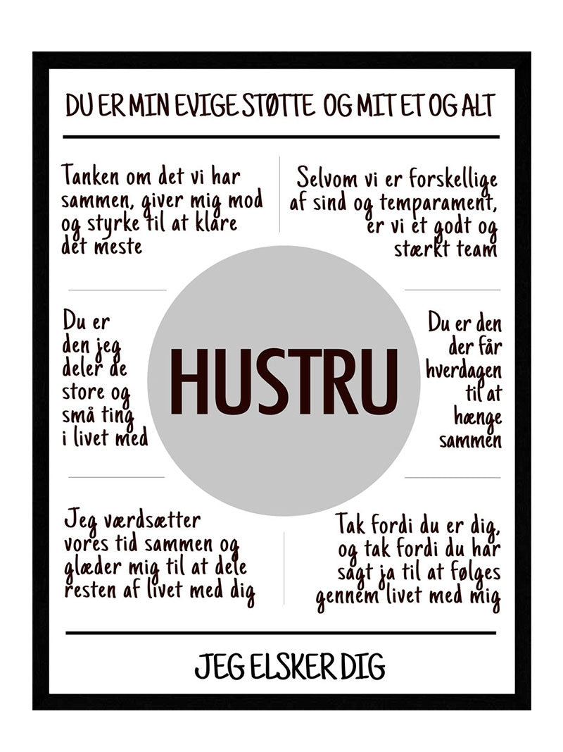 Plakatens overskrift vil gå lige til hjertet af enhver kvinde, når en mand udtrykker taknemmelighed til hende, og fortæller din kone, at hun betyder alt i hans liv. Nederst kommer der den ultimative kærligheds erklæring: De tre små ord, som man aldrig får sagt nok gange.