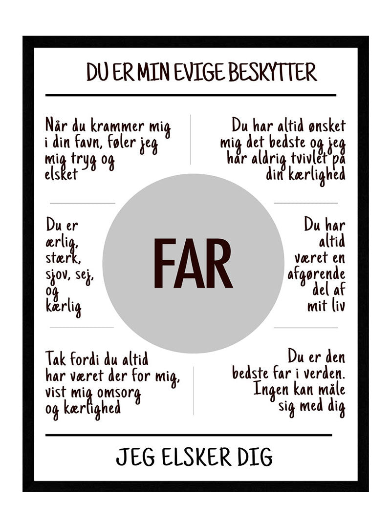 Kvaliteten af vores far plakat er helt i top, og de bliver trykt på 260 gram tykt Canon papir. Alle vores plakater trykkes på en mat overflade, så du undgår genskær i plakaten.