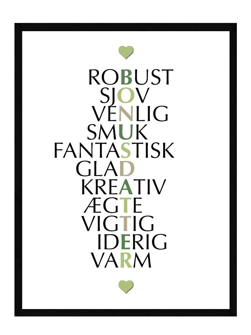 Designet på datter plakaten er holdt helt simpelt, så de dejlige sætninger kan komme i fokus og modtageren af plakaten vil kunne nyde de dejlige ord dag efter dag