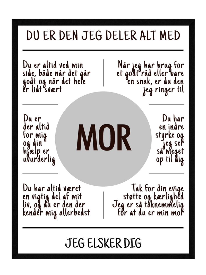 Vores flotte mor plakat er en helt personlig gave og siger alle de søde ting til din mor som du i hverdagen har svært ved at sige. Mor plakaten er på alle mulige måder den perfekte gave til din mor som betyder alt for dig.
