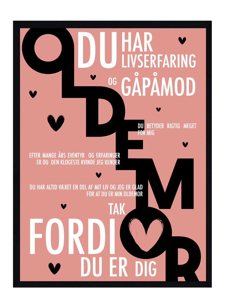 Så hvis du også mener, at din Oldemor er en helt speciel person i dit liv og du gerne vil fortælle hende, at du tænker på hende og mindes alle de gode minder i har haft, så er denne Oldemor plakat lige noget for dig.