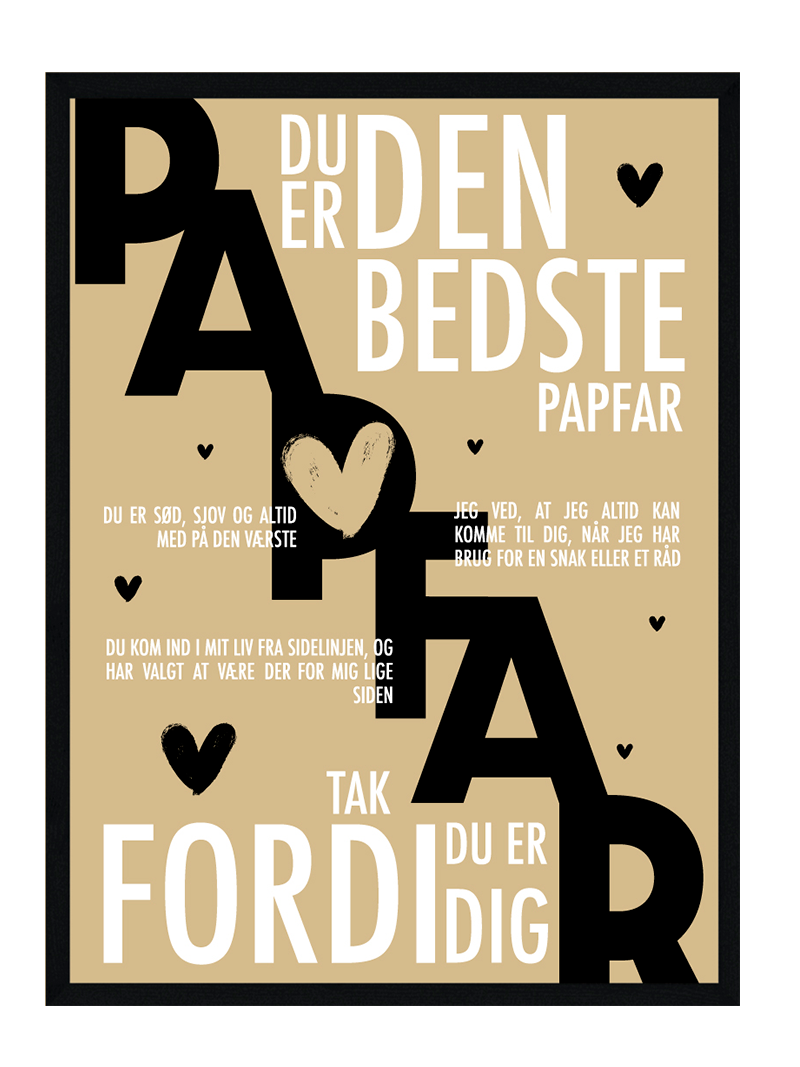Vores flotte Papfar plakat er en helt personlig gave og siger alle de søde ting til din Papfar som du i hverdagen har svært ved at sige. Papfar plakaten er på alle mulige måder den perfekte gave til din Papfar som betyder alt for dig.