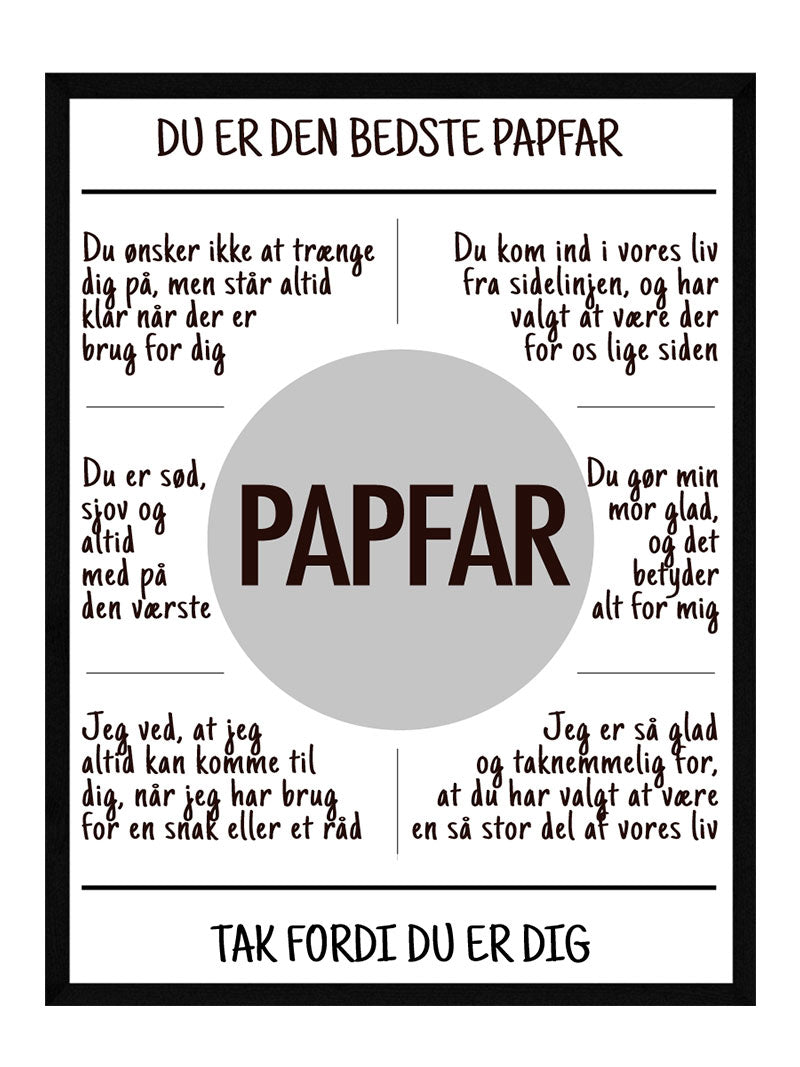 Så hvis du også mener, at din Papfar er en helt speciel person i dit liv og du gerne vil fortælle ham, at du tænker på ham og mindes alle de gode minder i har haft, så er denne Papfar plakat lige noget for dig.