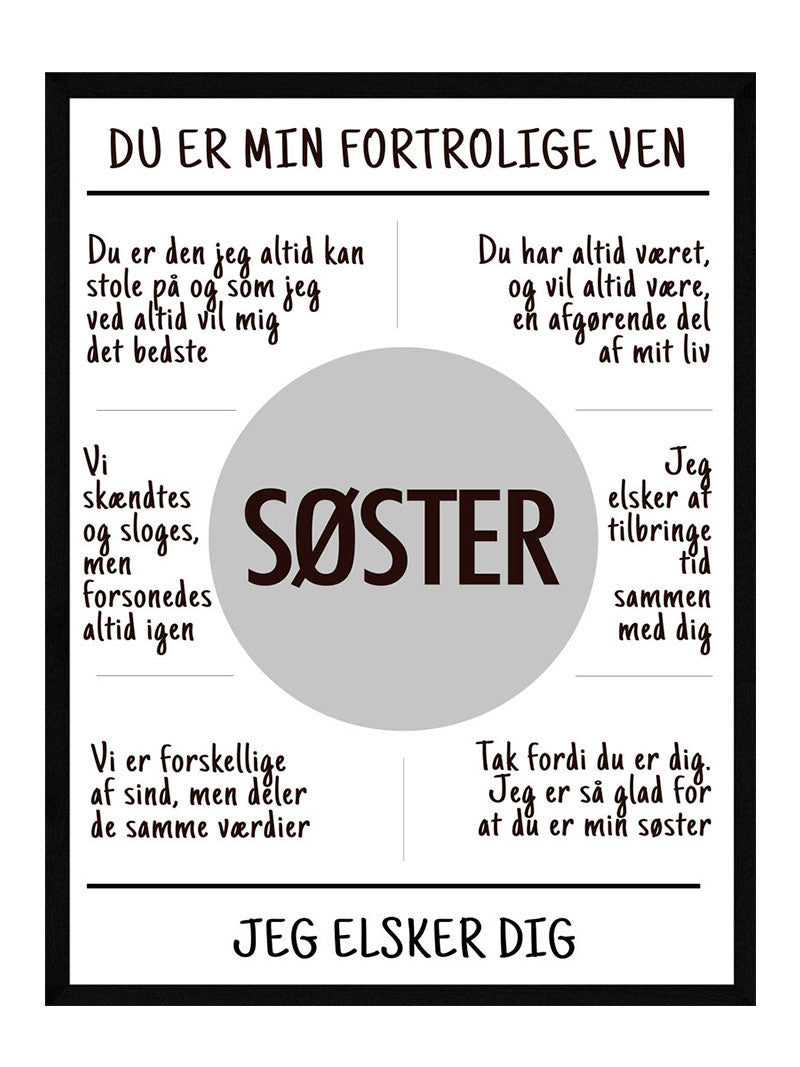Vil du gerne gøre din søster glad og give hende en god gave, men har altid svært ved at finde ud af præcis hvad du skal købe til hende? Vores flotte søster plakat er en helt personlig gave og siger alle de søde ting til din søster eller søstre som du i hverdagen har svært ved at sige. Denne plakat er på alle mulige måder den perfekte gave til din søster.