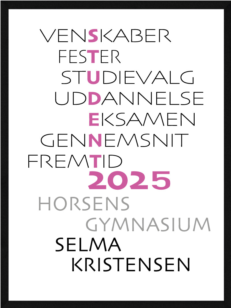 Vi kan tilbyde trærammer til vores studenter plakat i farverne eg, hvid og sort. Rammerne kan tilvælges under “Vælg tilbehør”. Når du tilkøber rammer hos os, sætter vi dine plakater i for dig, og så er de klar til at blive hængt op på væggen ved modtagelse.