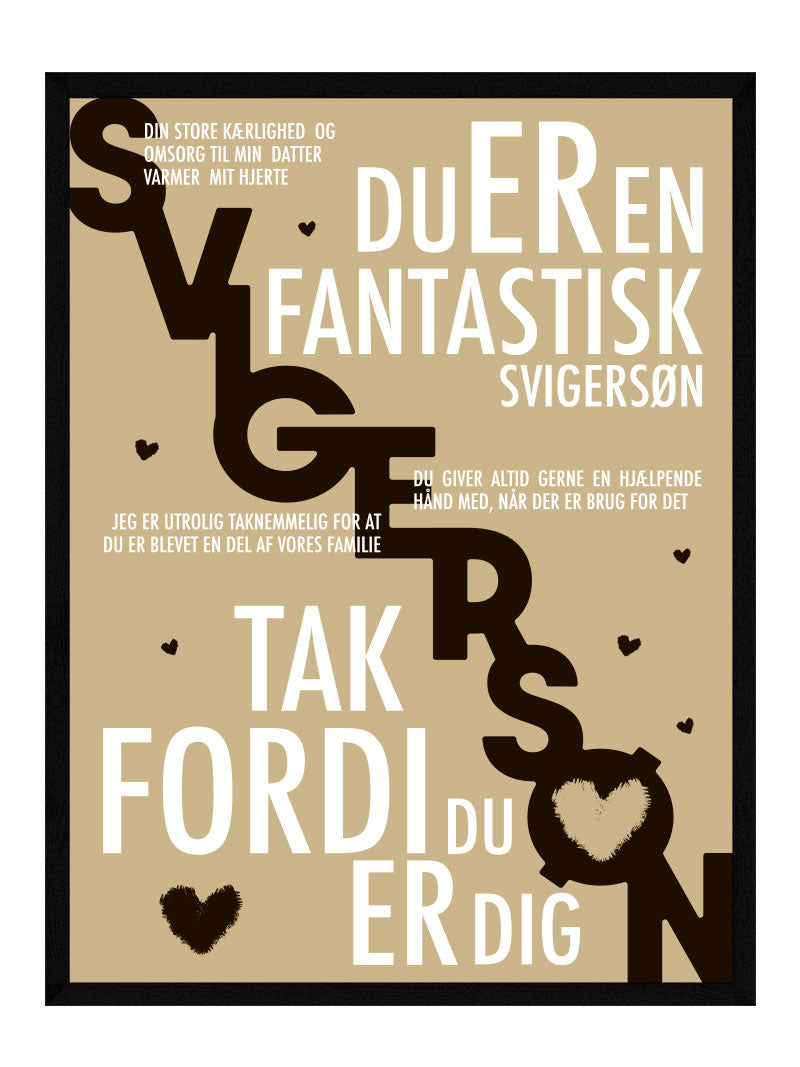 Designet på svigersøn plakaten er holdt helt simpelt, så de dejlige sætninger kan komme i fokus og modtageren af plakaten vil kunne nyde de dejlige ord dag efter dag